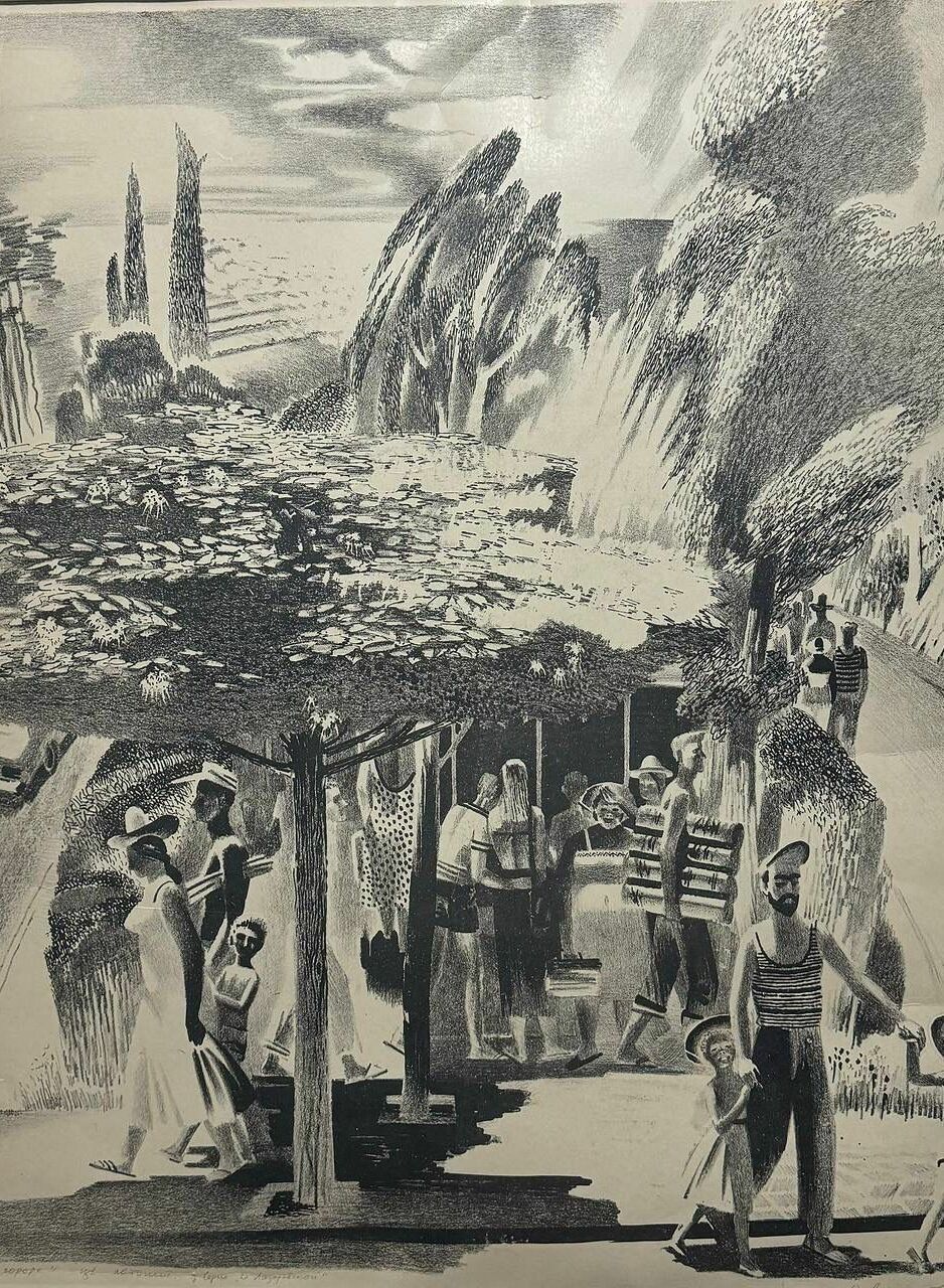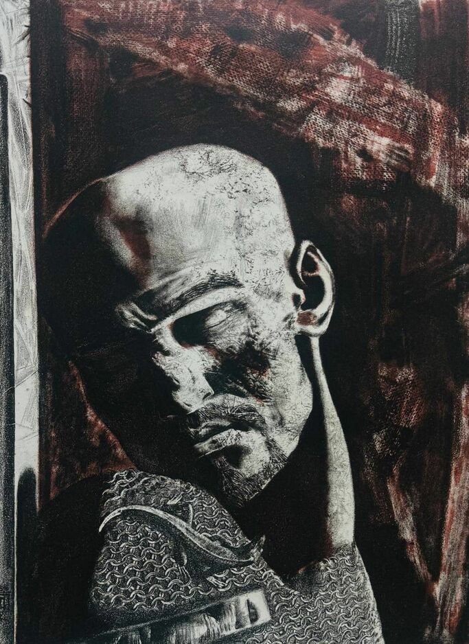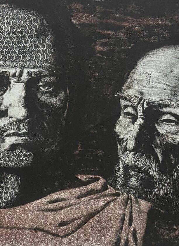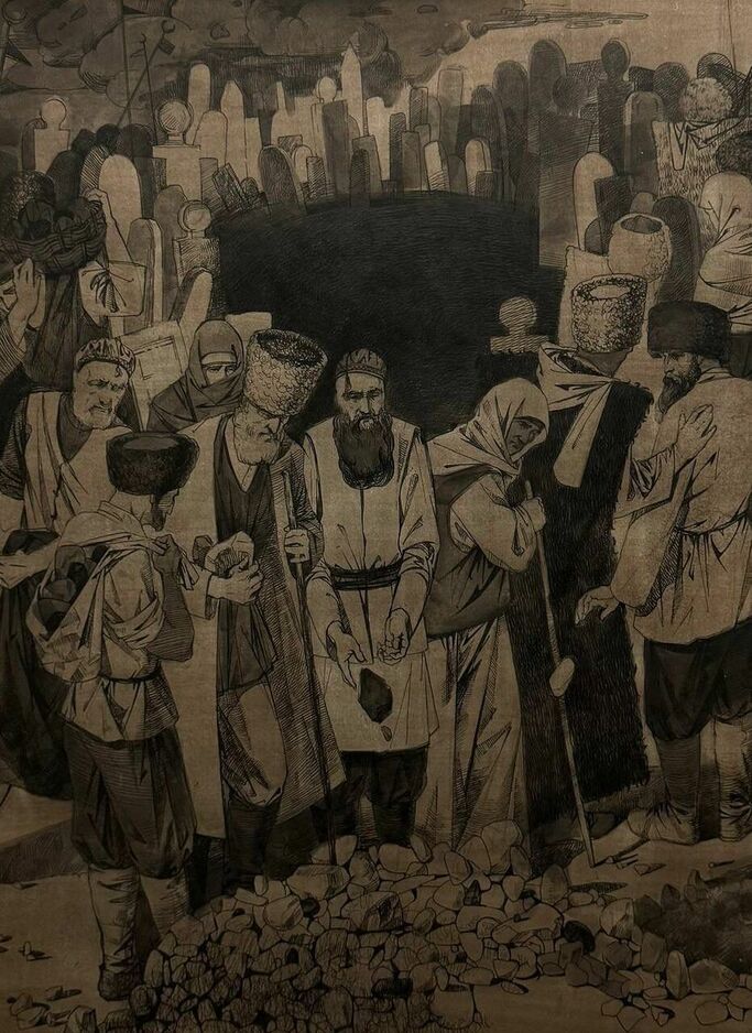Картина «Къарлаг». Автор: Бугаев Аслан Лемаевич Композиция в черно-белых тонах создает атмосферу эмоциональной напряженности. Толпа мужчин и женщин, с опущенными головами и скорбными лицами, бросает камни в одно место, отражая утрату и безысходность. Каждый жест вызывает мощный визуальный отклик, заставляя задуматься о коллективной боли и глубинных чувствах.
