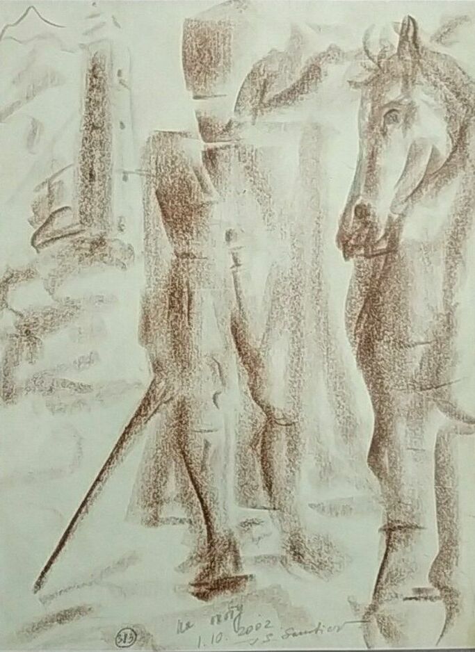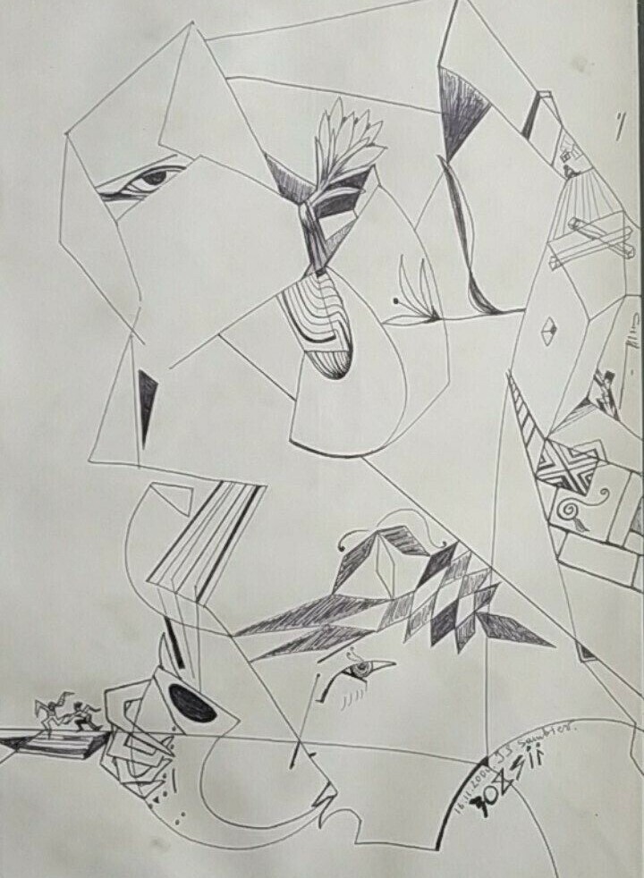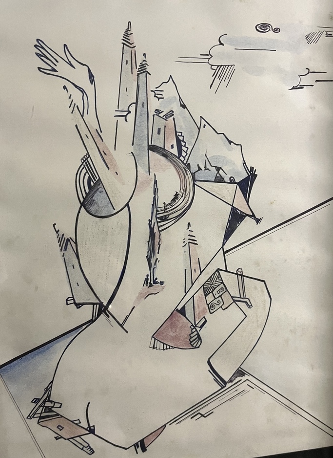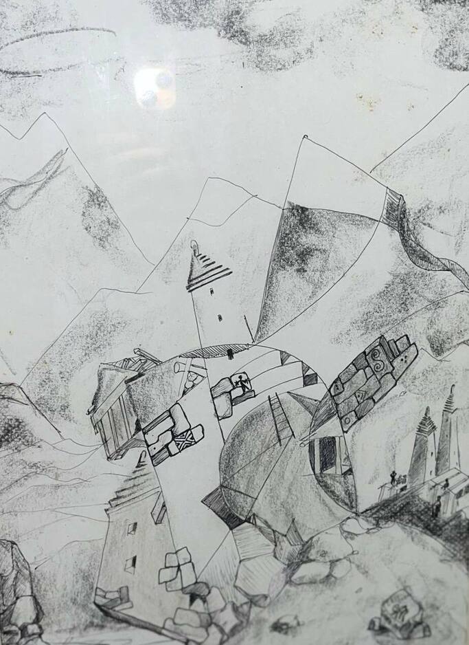 Картина «Поднебесные башни». Картина выполнена в графической технике(сюрреализм), в голубых, бордовых, тёмных и светлых тонах. На плоскости листа, в центре композиции, на фоне башенного комплекса - фигура женщины; элементы фигуры сводятся к геометрическим фигурам, создавая множество теней и образов. Автор: Самбиев Ибрагим Сайпудинович.