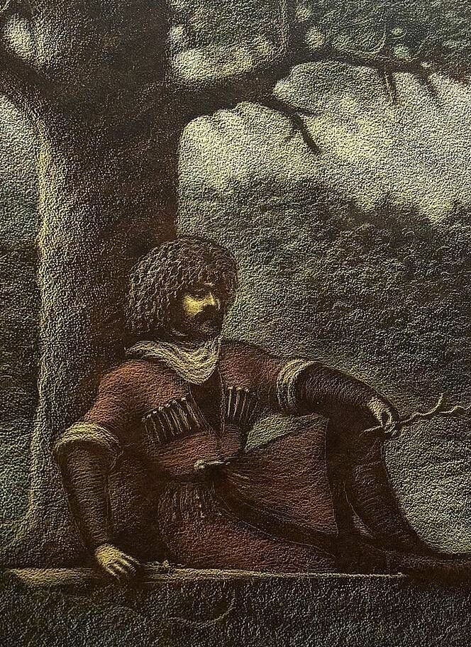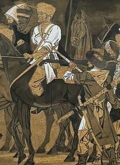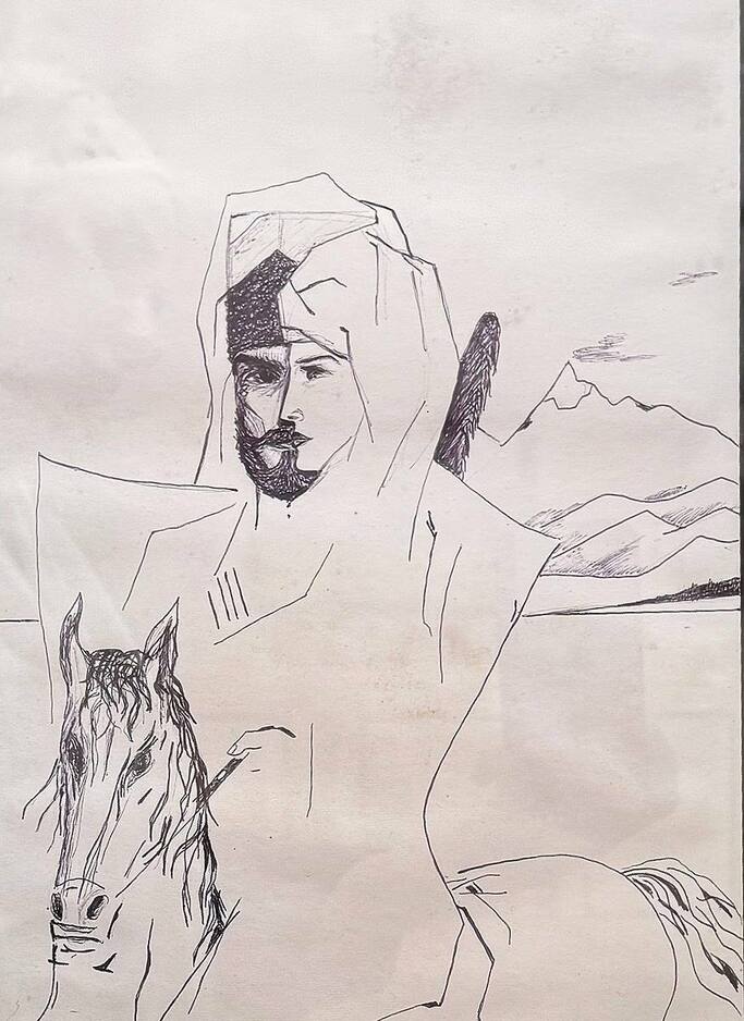 Картина «Мухаджиры». Автор: Самбиев Ибрагим Сайпудинович. Картина выполнена в графическом жанре в темных и светлых тонах. На переднем плане, на лошади - мужчина и женщина средних лет. На голове мужчины черная папаха с башлыком, лицо бородатое с усами. Женщина одета в белую одежду. На втором плане видны скалистые горные вершины и редкие облака.