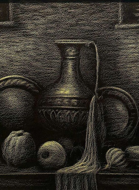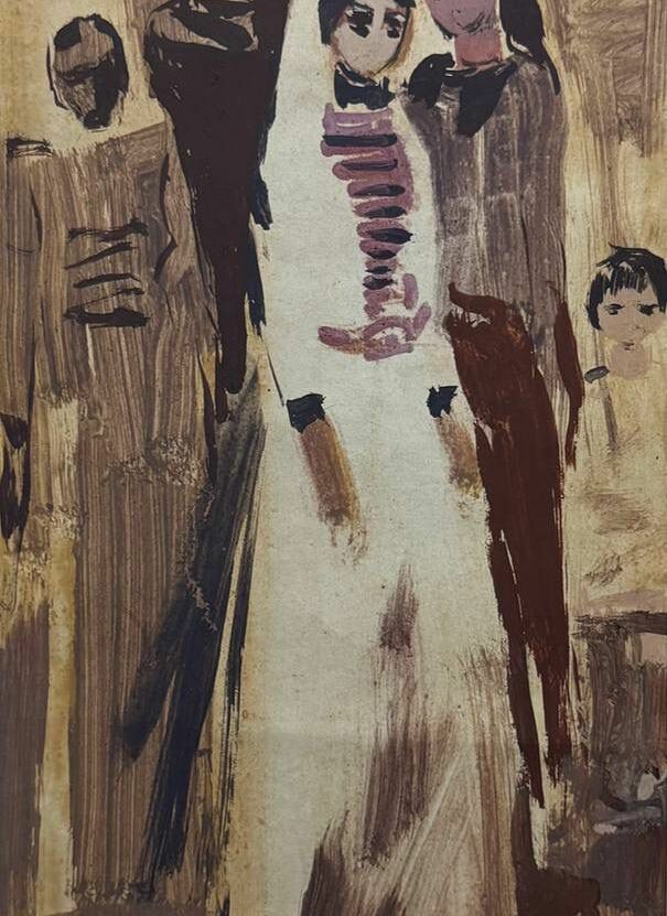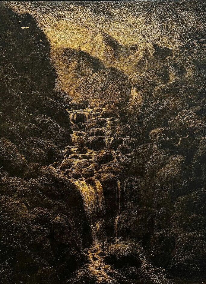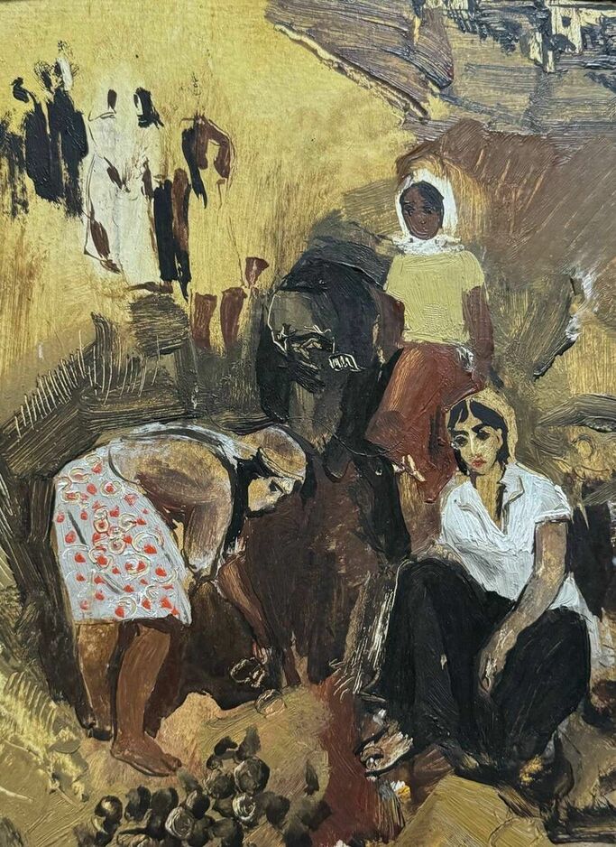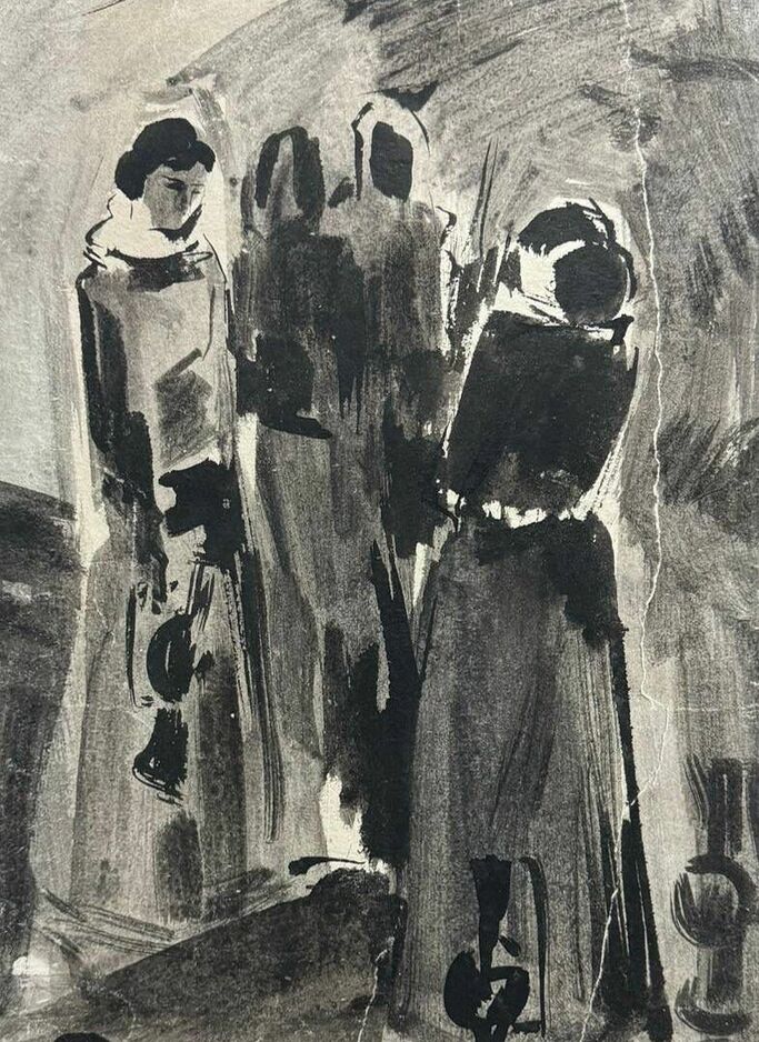Картина "У родника". Автор: Расуханов Арби Абдул-Каримович На картине словно застыла сцена из жизни. Темный фон подчеркивает красоту группы девушек, идущих с кувшинами для воды. Их фигуры легки и изящны, лица полны достоинства и спокойствия. Здесь отражены обычаи и традиции чеченского народа, переданные художником с нежной тоской и глубоким уважением.
