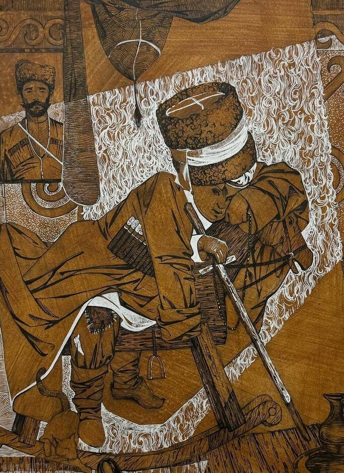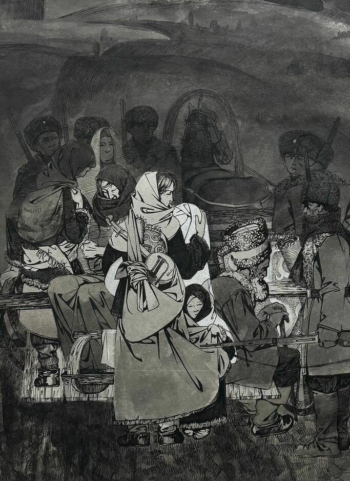 Картина «Депортация вайнахов». Автор: Бугаев Аслан Лемаевич Работа в черно-белом графическом жанре изображает Кавказский народ во время Депортации. На переднем плане женщина с девочкой за подолом платья, а позади — обоз со старейшинами, окруженный русскими солдатами. Бескрайние поля на дальнем плане усиливают атмосферу безысходности и напряженности.