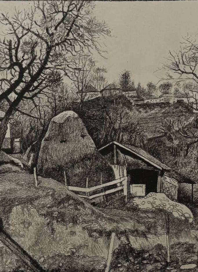 Картина «Эртан-7». Автор: Чамаева Эсет Сайд-Эмиевна. Сельский пейзаж выполнен в графическом жанре. На переднем плане - плетенный забор, за ним холмистая поверхность. На втором плане, в центре композиции - стог сена, за ним по обе стороны два больших дерева. На дальнем плане - склон горы с деревьями и постройками.