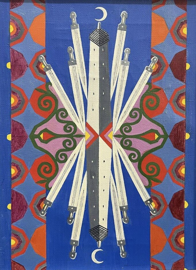Картина «Кинжальный дождь». Картина выполнена в технике масляная живопись - в белых, серых, синих, красных, желтых, розовых и зеленых тонах. На голубом фоне в центре композиции - боевая, зеркальная башня с луной под камнем цурка. По обе стороны башни - повседневные кинжалы горцев. По бокам картины национальный орнамент. Автор: Самбиев Ибрагим Сайпудинович.